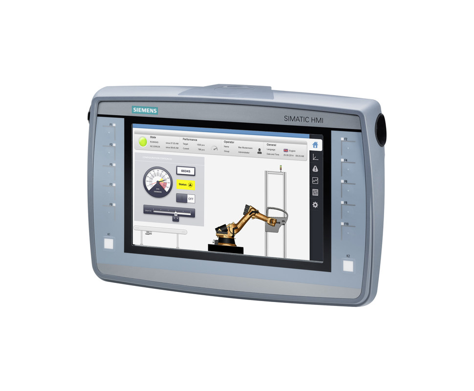 8 teclas de función, 1x interfaz PROFINET/Industrial Ethernet, 1x tarjeta multimedia, 1x USB, configurable desde WinCC Comfort V13 SP1